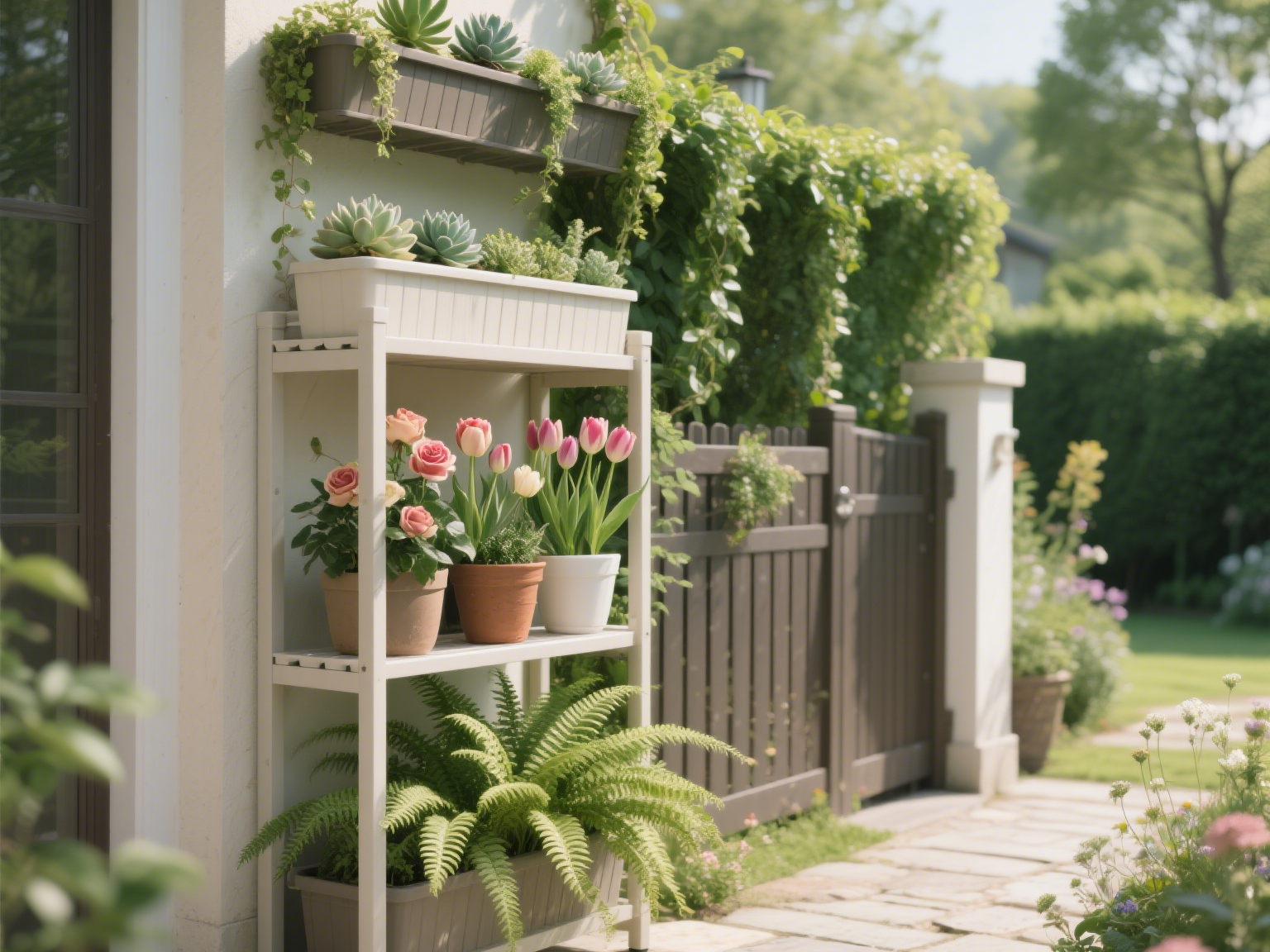 In balconies or windows, hanging PVC plant stands are ideal for creating “sky gardens”. Mounted on railing hooks without taking up floor space, they can grow trailing plants like petunias or string-of-pearls, forming cascading flower displays. In courtyards, floor-standing multi-tiered stands create vertical gardening systems: shade-loving ferns at the bottom, roses or tulips in the middle, and succulents at the top, optimizing light distribution by height. Combining stands with fences—such as adding planters to fence tops for climbing vines—creates natural green barriers that define space and enhance privacy.
